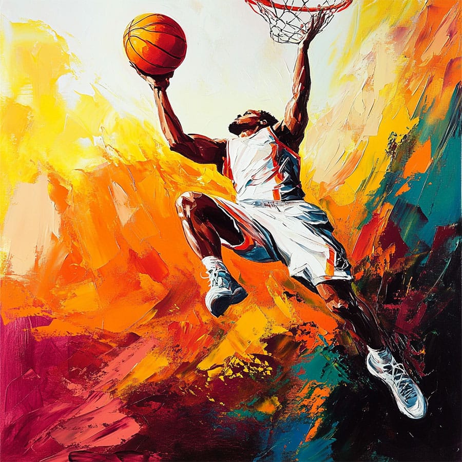 Have you ever dreamed of flying? Not with wings, not in a plane… but with a jump so powerful you could touch the sky, dodge the clouds, and—bam!—slam the ball through the hoop like a bolt of lightning. That’s what it means to dunk in basketball. And that’s exactly what’s happening in this drawing: a player soaring through the air, about to make a dunk that will shake the rim.