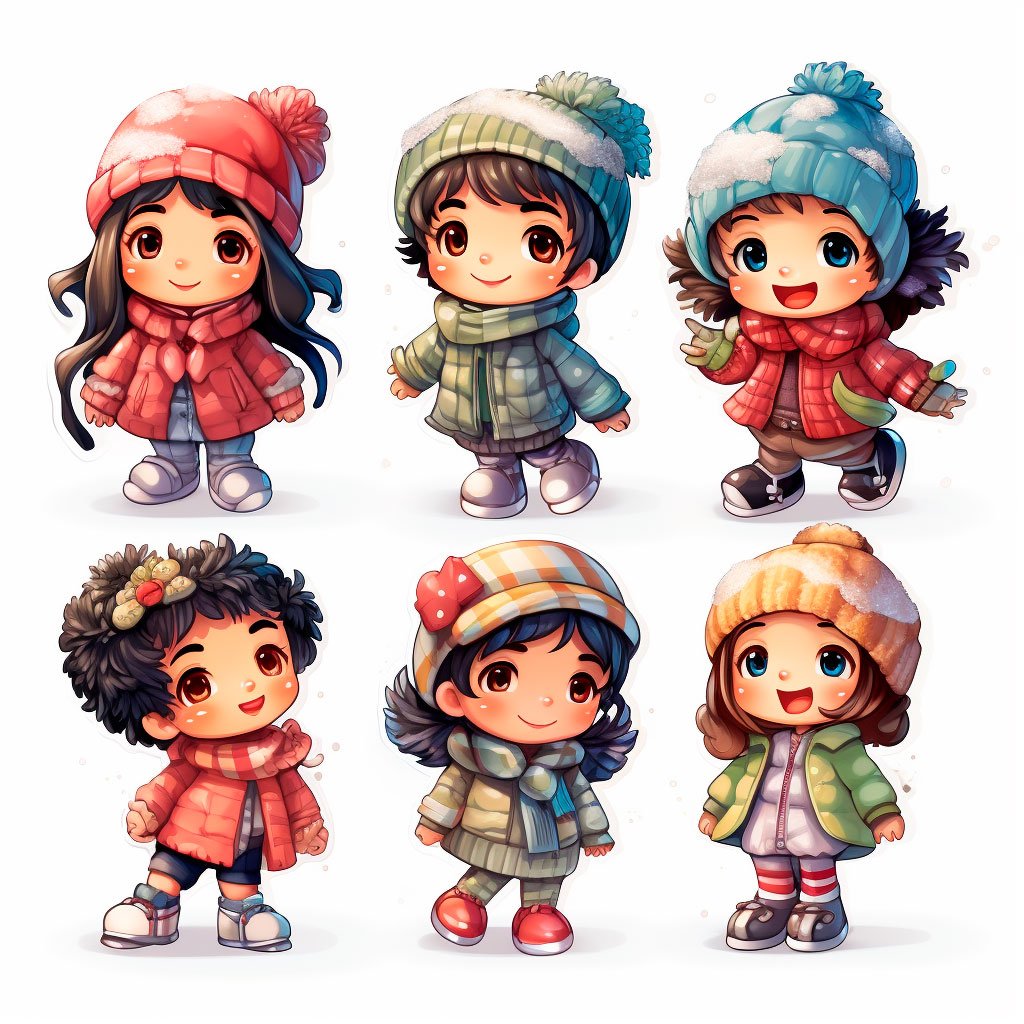 Winter Clothing: Color the children’s coats, scarves, hats, and gloves with striped patterns or Christmas designs like snowflakes or reindeer.
