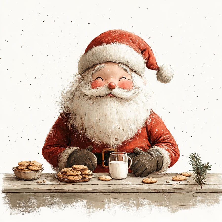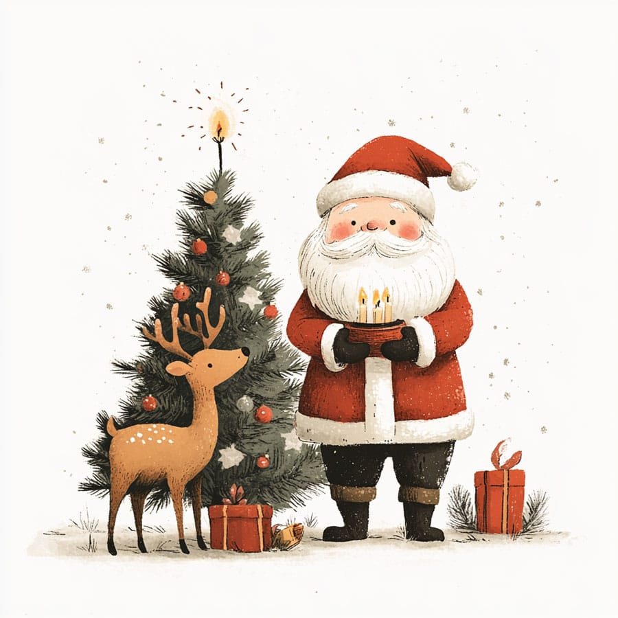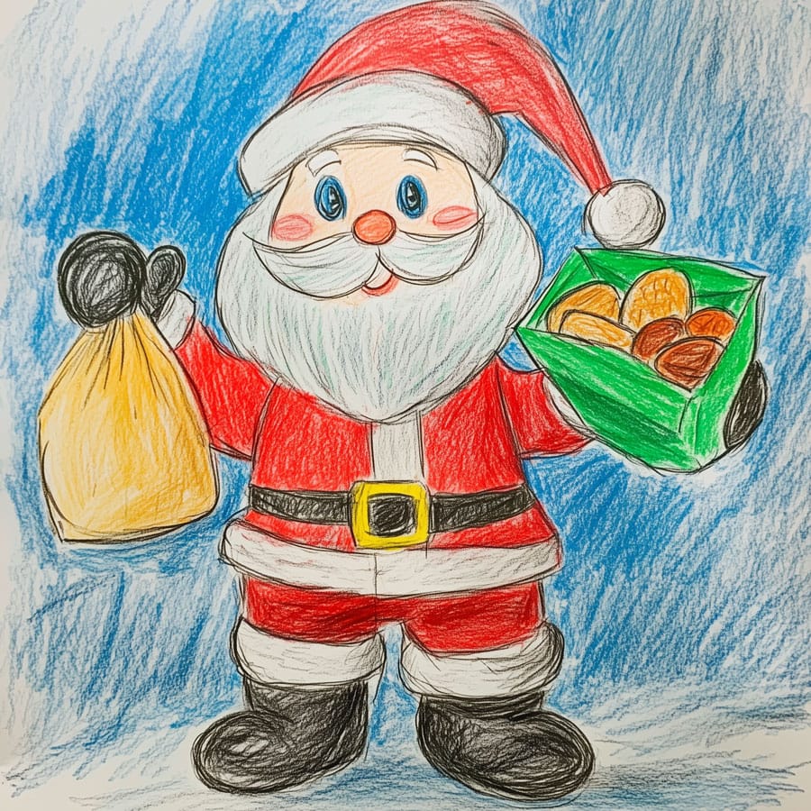 The drawing depicts a cheerful Santa Claus waving under a starry night, with a present at his feet and decorated trees in the background. The smiling moon adds a magical touch, capturing the festive and joyful spirit of Christmas.