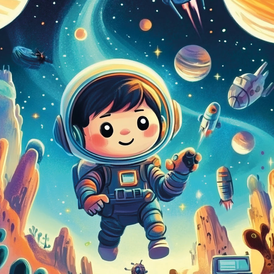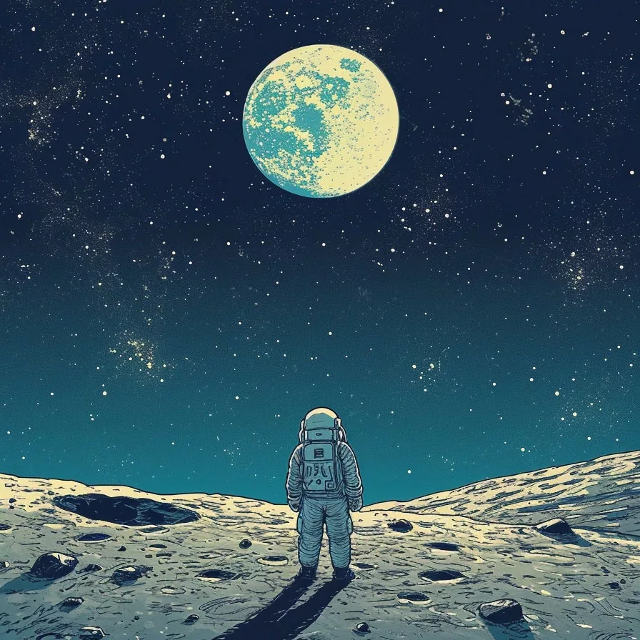 This drawing may seem simple, but it presents many interesting challenges when coloring. The lunar or planetary environment is monochromatic—gray, pale tones, without many bright colors. That’s why the artist has the chance to invent new atmospheres: a greenish sky, purple sand, blue lights reflected by a different sun.