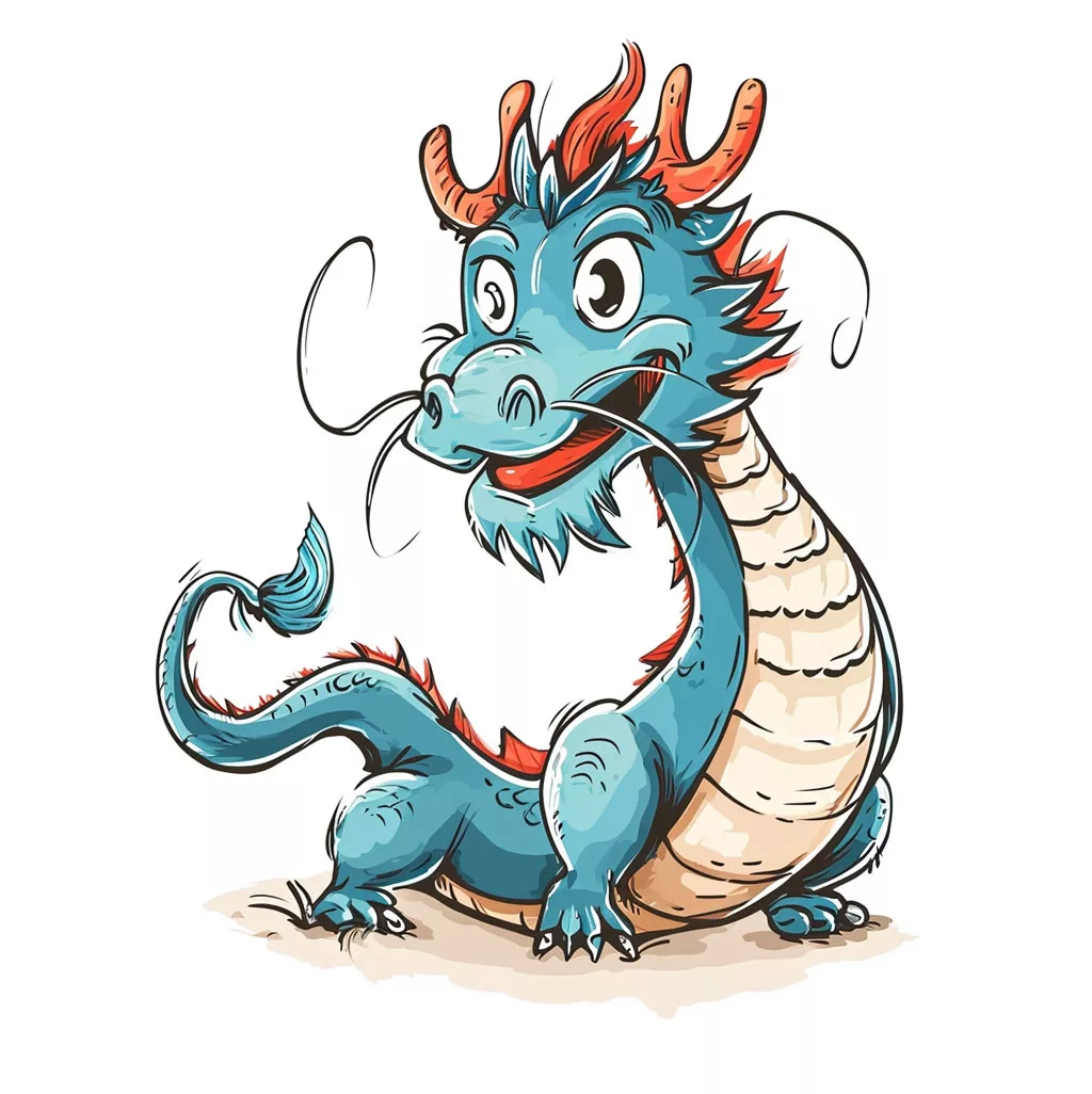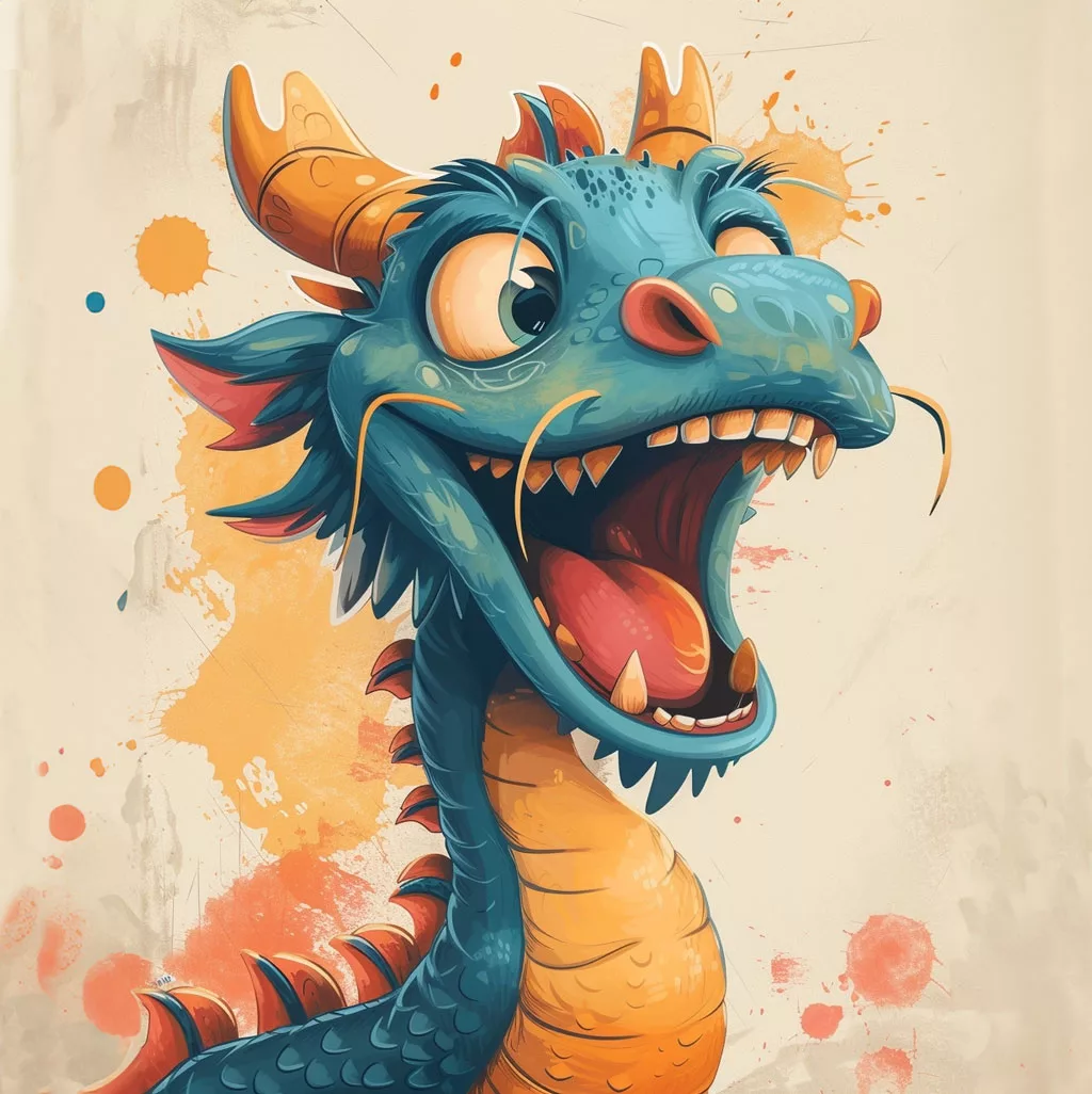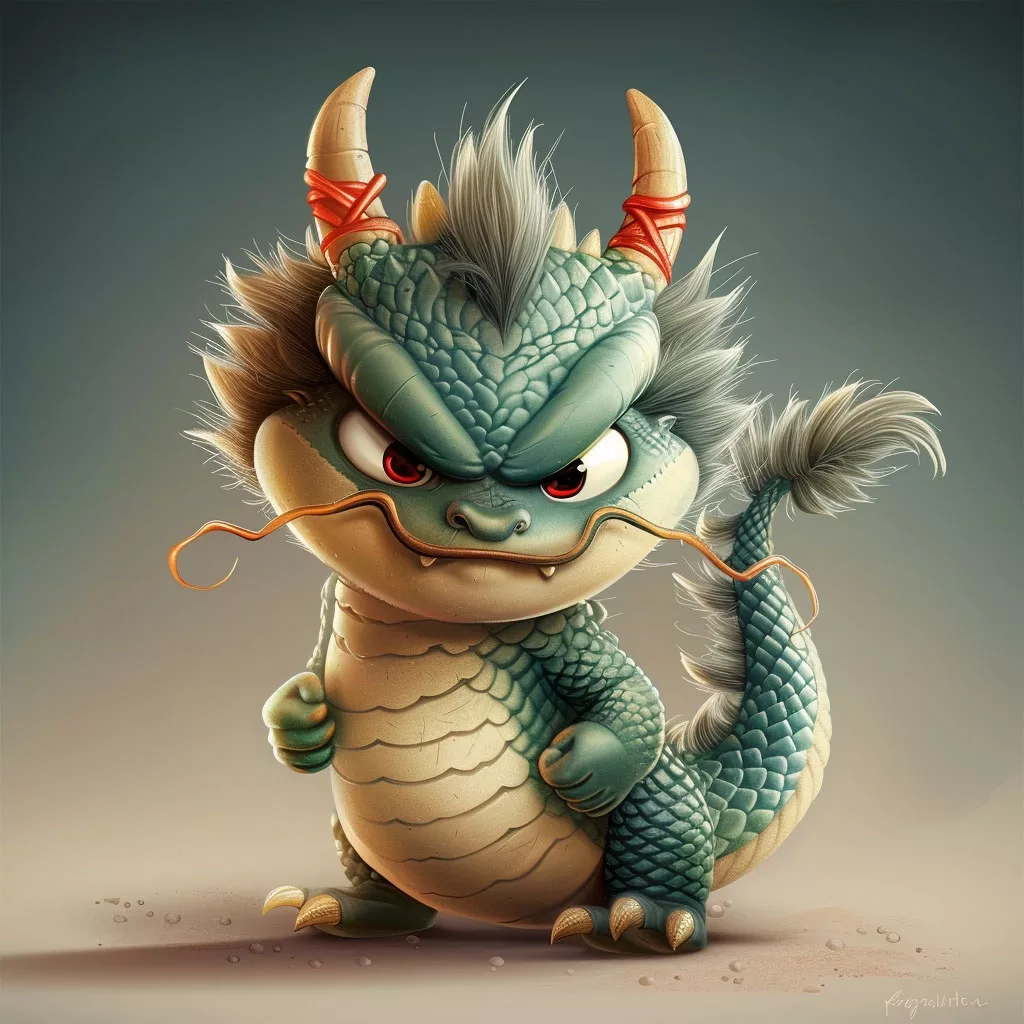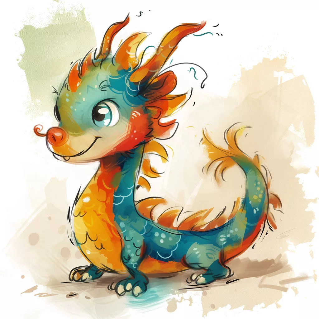Dragons, those majestic creatures that soar through the skies with their mighty wings and spit fire with fury, are a source of fascination for children and adults alike. This little dragon seems to be practising his fire-throwing skills, which he will surely need when growing up. His expression shows determination as if he is learning to control his powers. Who knows what adventures await him as he grows up in this mysterious world of mountains and cloudy skies?