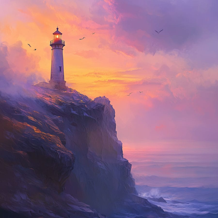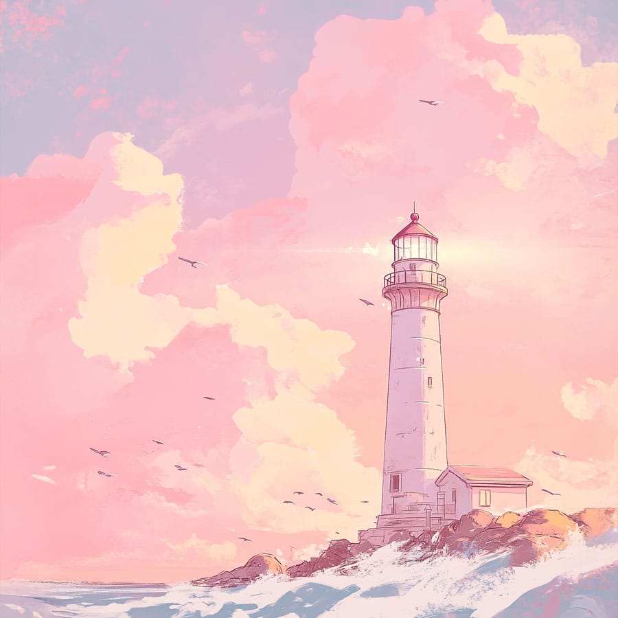 To color this lighthouse, you can start by defining a time of day: sunrise, sunset, or night. If you choose a warm sunset sky, blend orange, pink, and lilac tones into the clouds, keeping the horizon lighter and the sky more intense at the top. If you prefer a daytime setting, use soft blues and whites, adding touches of light to the upper parts of the clouds. The lighthouse can have a white or cream base with grayish shadows on one side. Add subtle highlights with lighter pencils or blend using cotton swabs.