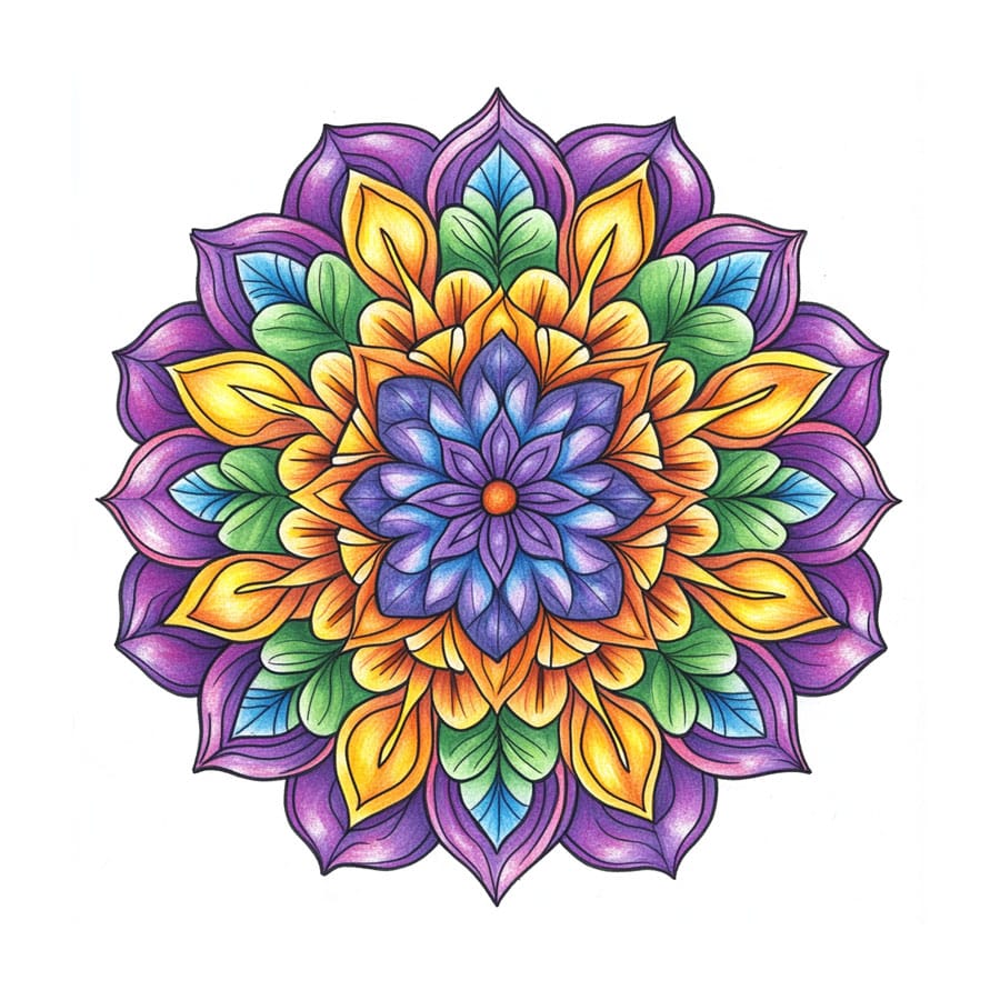 Color from the Inside Out: Start coloring from the center outward to keep a structured focus. The center of the mandala is usually the focal point, so you can use more intense colors there and soften toward the edges.