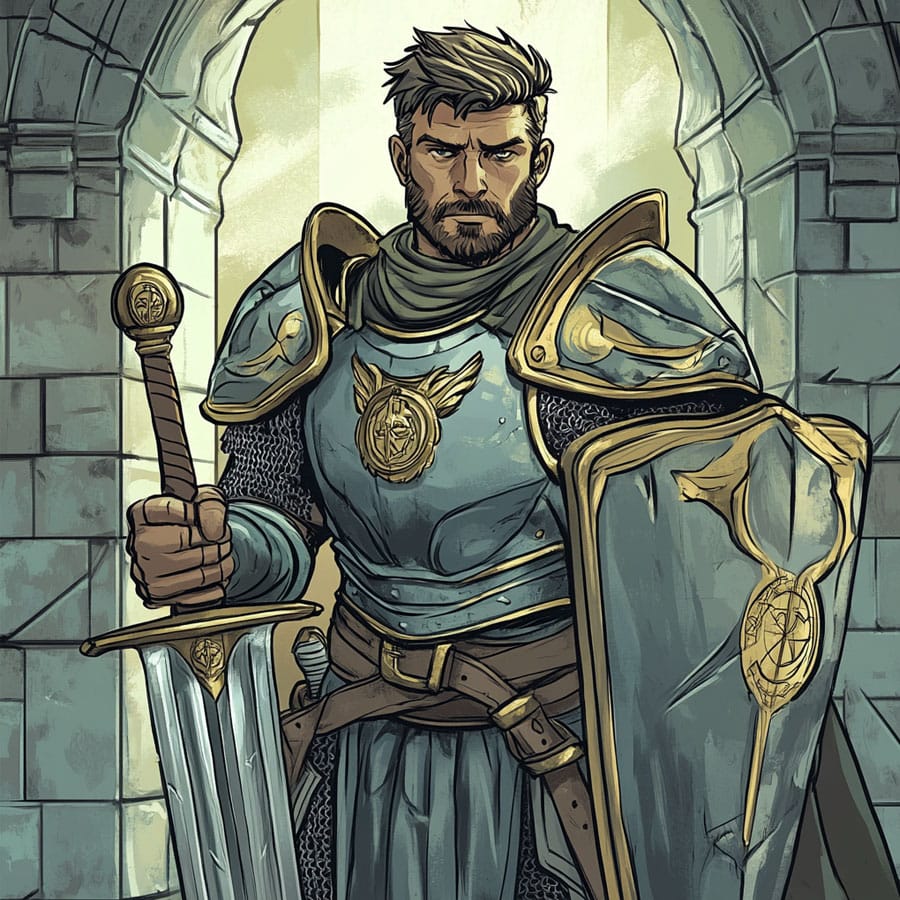 Details such as the sword and shield can stand out with metallic colors, but if you want to add a touch of fantasy, you could use bright blues or greens to suggest they have magical powers, a nod to Arthurian legends.
