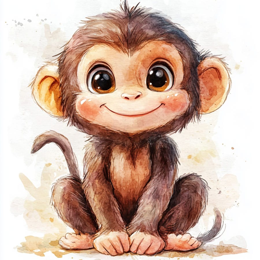 The monkey can be colored with warm browns or greys, typical of many primates. To add depth to the fur, you could use layering techniques, applying a light base color first and then adding shadows with darker pencils. You can also highlight the shine in its fur with lighter tones around the cheeks and top of the head to emphasize its energy.
