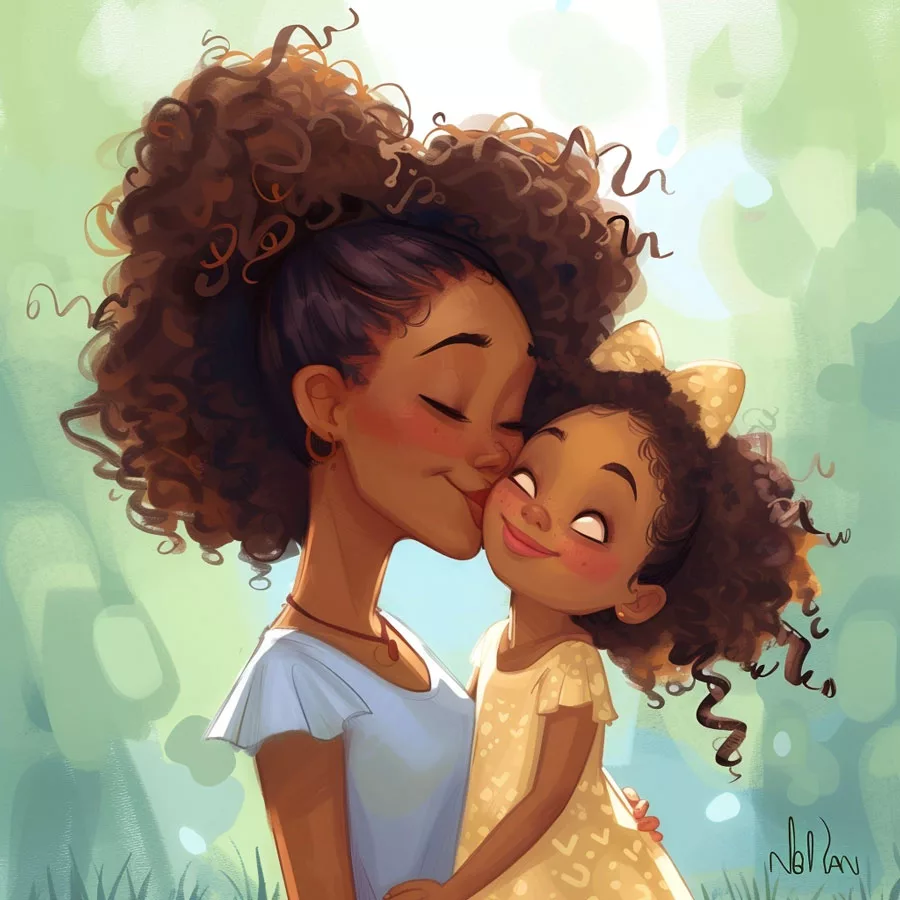 • Hair: The mother may have beautiful curly or Afro hair. Use dark brown or black tones for the hair, and you can add some lighter touches to show the shine of the hair.