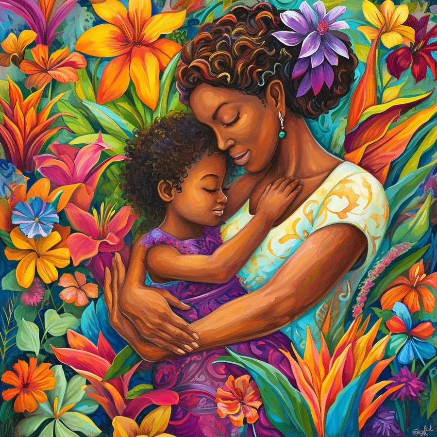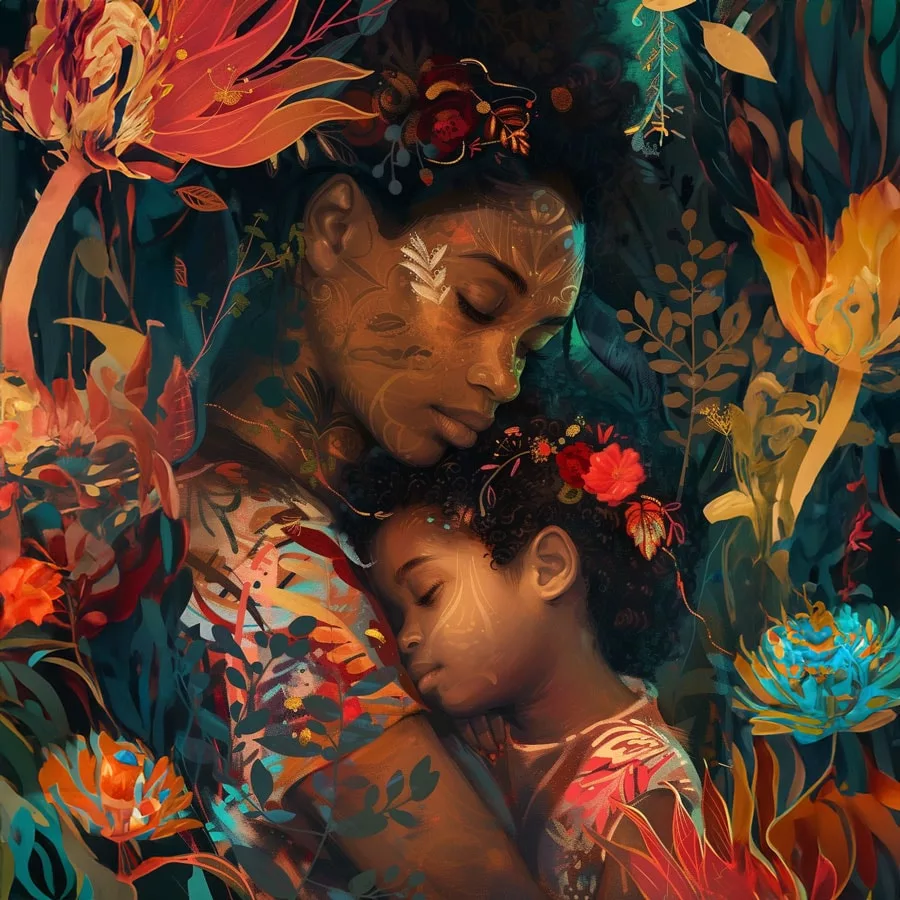 Today, I want to talk to you about a type of family that shines with its light: Afro-descendant families. Take a look at the drawing filled with lines showing an African American mother with a radiant smile, tenderly embracing her baby against a floral background full of greenery. It’s a beautiful image of love and family unity! Would you like to bring this drawing to life with your favourite colors?