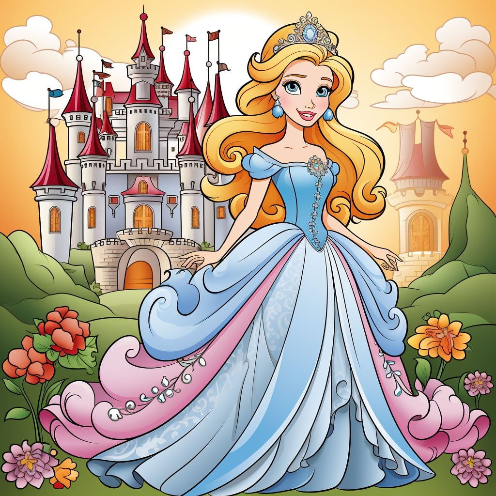 The princess’s dress offers another great area for creativity. You can choose a single pastel color, like pink or lavender, and then add shadows in the folds to give it volume and depth. Additionally, the small floral decorations on the dress can be painted in bright or pastel colors, creating a delicate effect. Don’t forget to add shadows along the edges of the dress and under the arms to make it look like it’s really moving in a fantasy world.