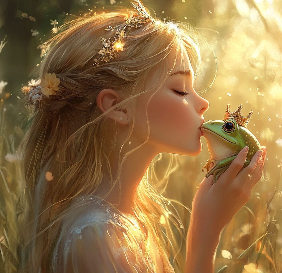 This image evokes one of the classic themes in fairy tales: the relationship between a princess and a frog. Inspired by stories like “The Frog Prince” by the Brothers Grimm, this scene captures the moment when the princess, despite her surprise or doubt, gazes at the frog, who turns out to be an enchanted prince. These tales often teach values like the importance of looking beyond appearances and appreciating kindness and character.