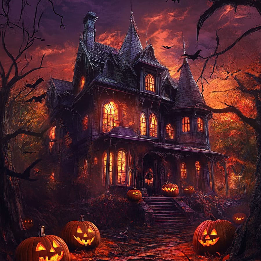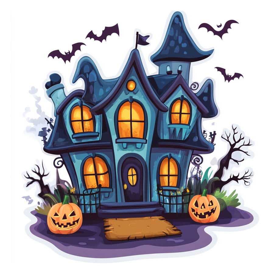 5. The sky and bats: For the sky in the background, you can use a dark blue or deep gray. If you want the perfect Halloween night scene, add a gradient that goes from dark blue at the top to lighter gray near the house. The bats and tree branches can be completely black to add mystery.