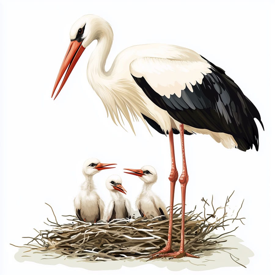 Storks typically inhabit areas near bodies of water, such as rivers, lagoons, and swamps, where they find much of their food. Their diet is varied and mainly consists of fish, frogs, insects, and small mammals. These birds are particularly known for their large, durable nests, which they build in tall trees, towers, or poles. Stork nests can last for several years and are often reused by the same pair or their offspring in subsequent nesting seasons.