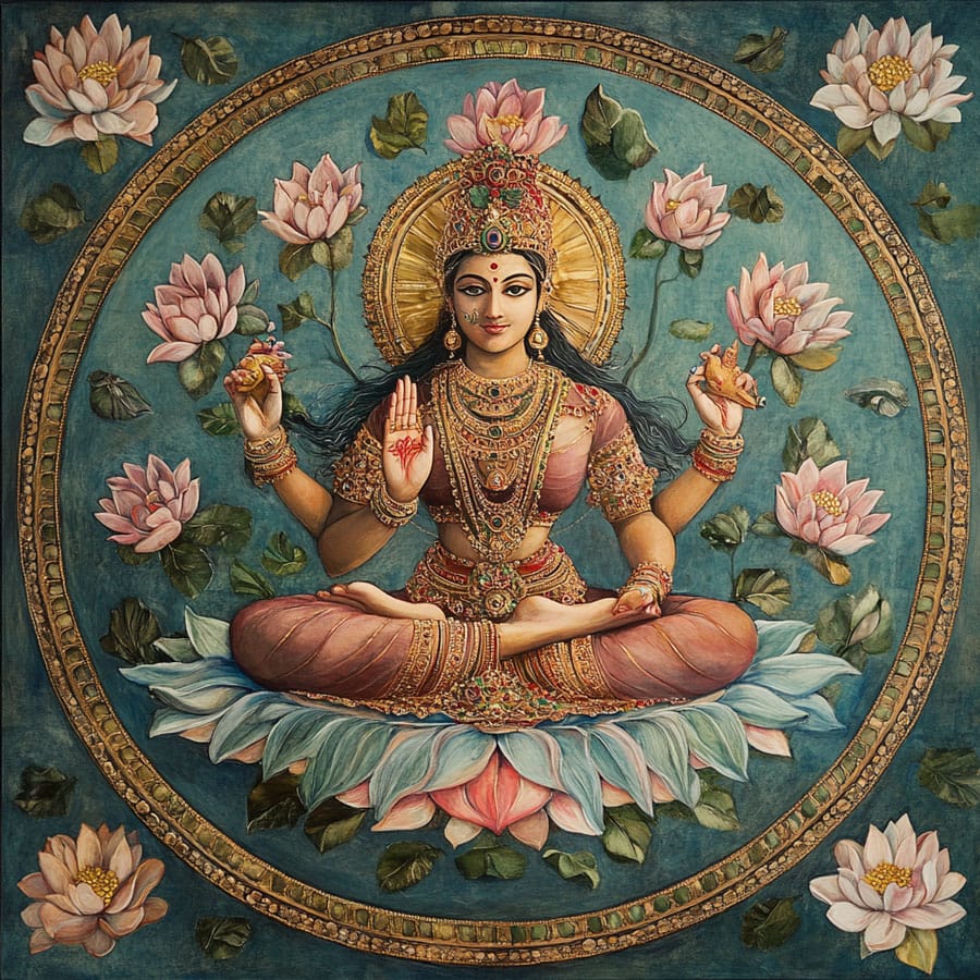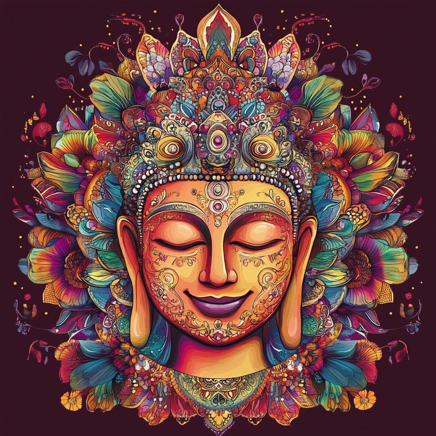 This illustration portrays a female figure embellished with symbolic elements and geometric motifs. The design showcases a traditional aesthetic that appears to draw inspiration from Asian or Hindu cultural influences. The image is encapsulated within an ornate circular frame, adorned with floral elements and recurring patterns. The harmonious balance between symmetry and intricate detail renders this drawing an excellent exercise for honing one’s attention to detail and cultivating patience.