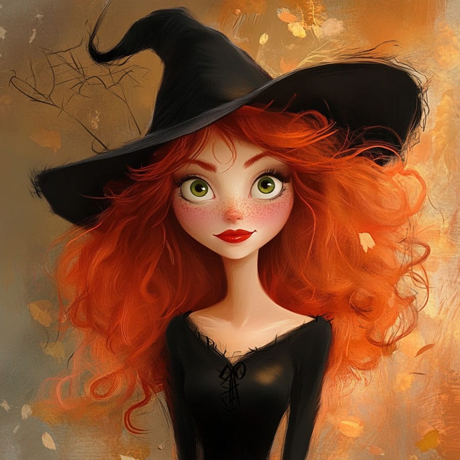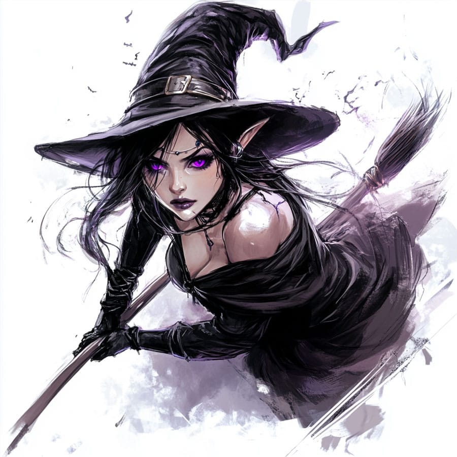 The witch’s long, wavy hair is a great opportunity to experiment with various colors. If you want to go for a classic style, choose blonde or brown tones. For a more supernatural look, try silver whites or dark blues, which would give her a more ethereal and mysterious vibe. Add highlights to the strands of hair exposed to the moonlight and shadows near the face and hat to create a more lively and dynamic texture.