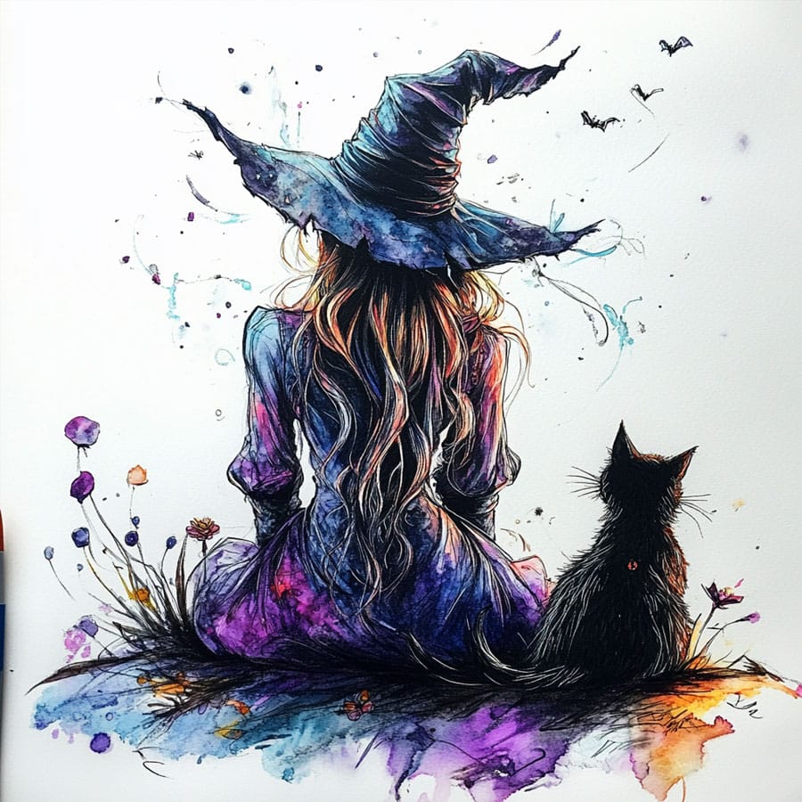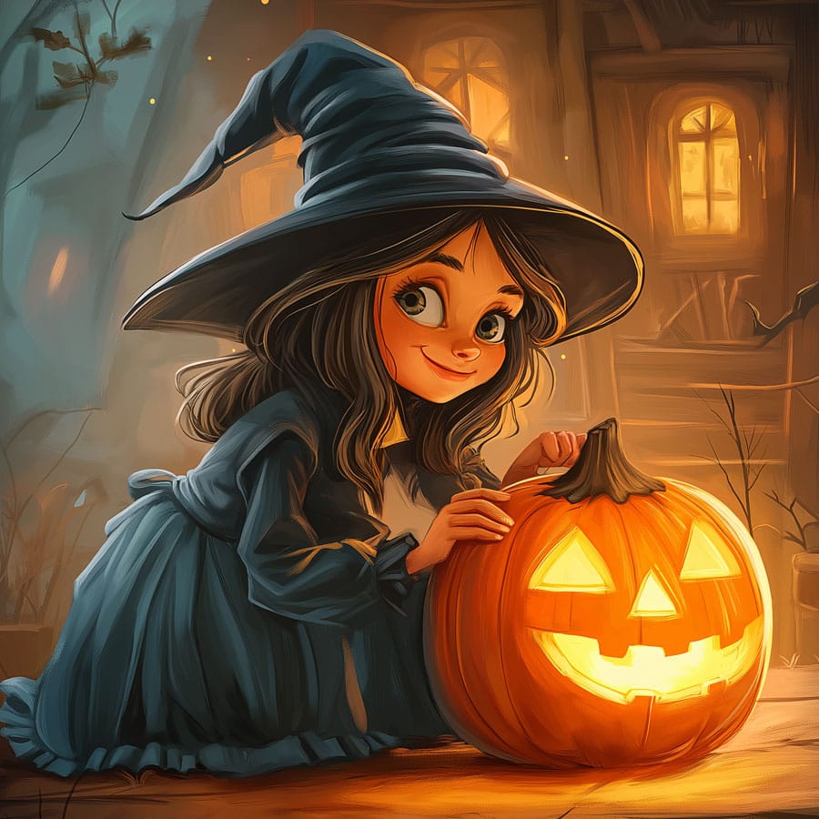 This drawing perfectly encapsulates the festive and slightly eerie ambience of Halloween. The young witch, with her confident stance and charming smile, seems ready for the magic that this special night brings. The classic Halloween elements, such as the carved pumpkin and bats, give it that traditional touch that defines this holiday, while the castle in the background makes us imagine a story full of spells and hidden secrets.